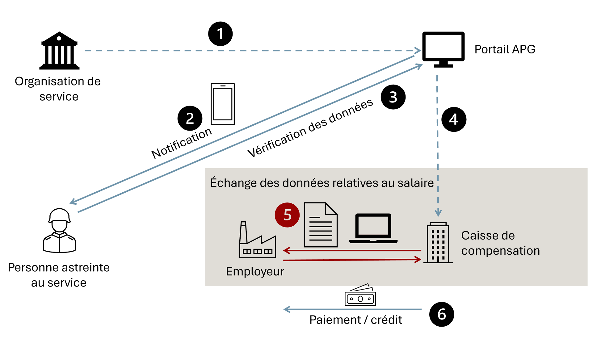 Les allocations pour perte de gain (APG) indemnisent les personnes qui interrompent momentanément leur travail (service militaire ou civil, protection civile et interventions dans le cadre de Jeunesse + Sport). Elles ont droit pendant cette période à une indemnité journalière APG qui compense en partie la perte de gain. Le calcul de cette indemnité journalière est basé sur les données salariales de l’employeur transmises à la caisse de compensation concernée.