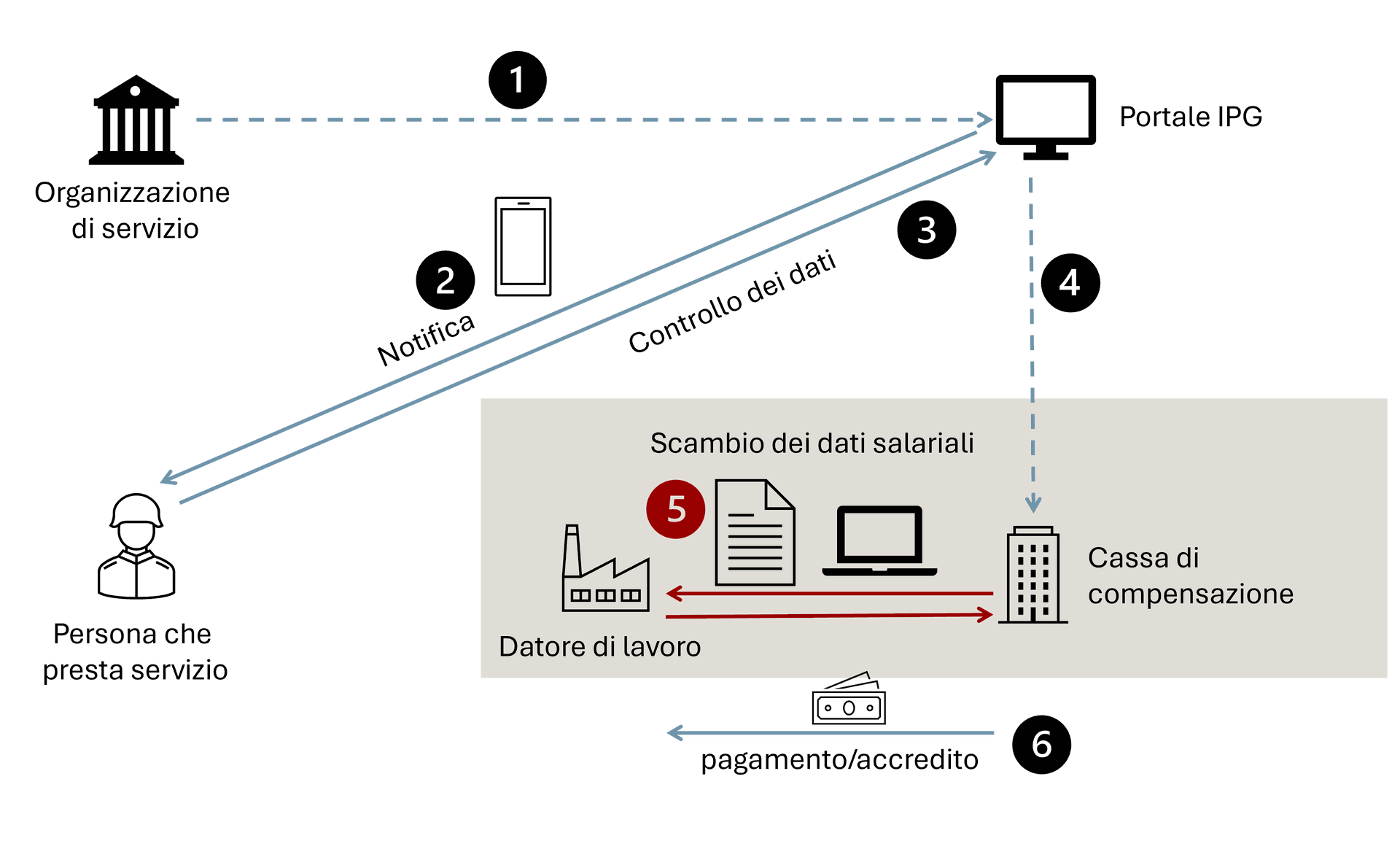 L’indennità per perdita di guadagno (IPG) serve a indennizzare le persone che interrompono temporaneamente la propria attività lavorativa (servizio militare, civile o nella protezione civile, nonché impieghi nell’ambito di Gioventù + Sport). Durante tale periodo gli interessati hanno diritto a un’indennità IPG a parziale compensazione della perdita di guadagno. La base per il calcolo dell’indennità è rappresentata dai dati salariali del datore di lavoro che vengono trasmessi alla cassa di compensazione competente.